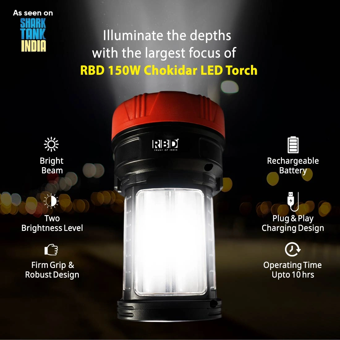 Discover the ultimate rechargeable flashlight – RBD Kissan Light. With 10 hours backup, ultra-bright LED, and a durable design, this small rechargeable torch is perfect for home, farm, and outdoor use.