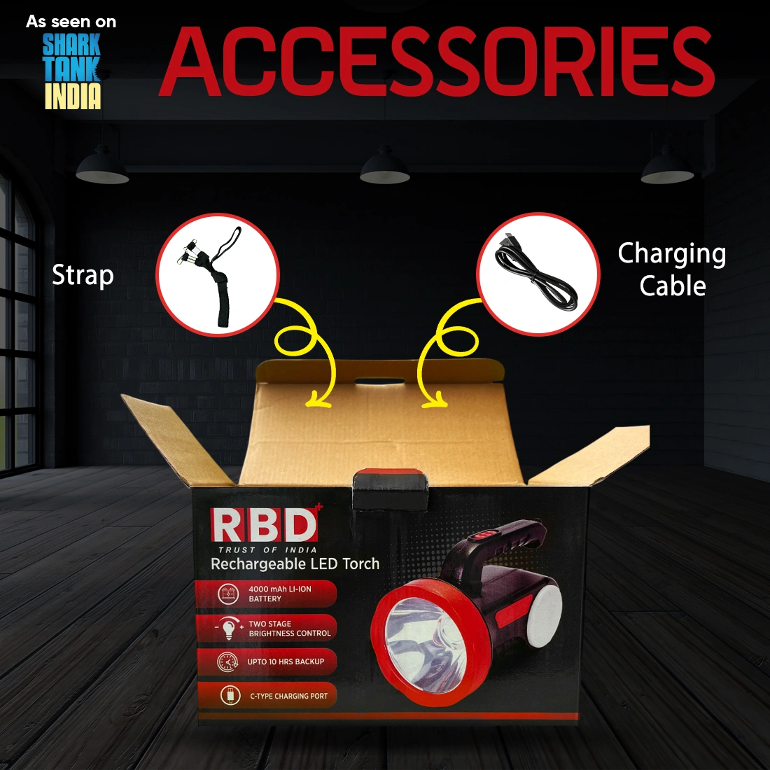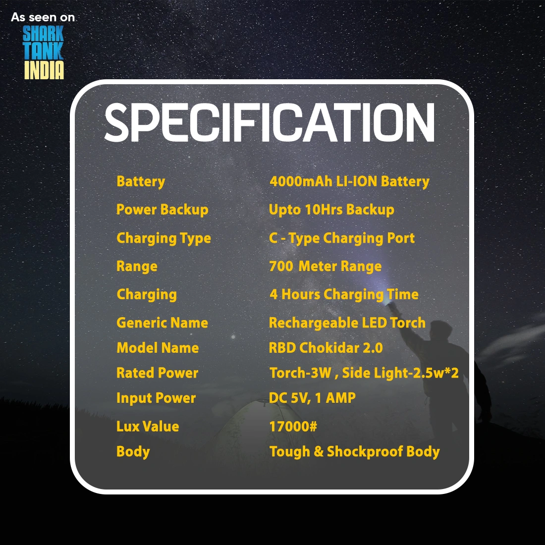 The RBD Chokidar 2.0 is a powerful rechargeable LED torch designed for farmers, outdoor enthusiasts, and emergency situations. Combining military-grade brightness, rugged durability, and USB-C fast charging, it delivers reliable illumination wherever you need it.